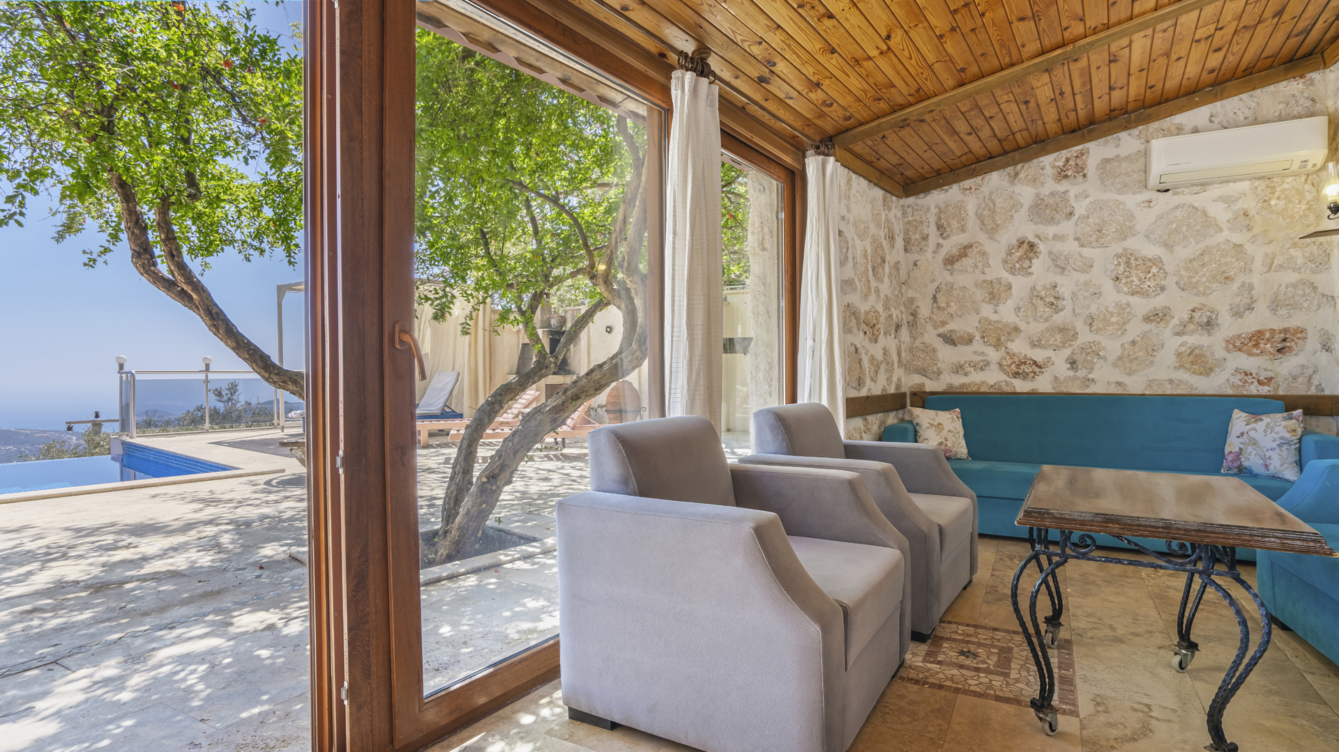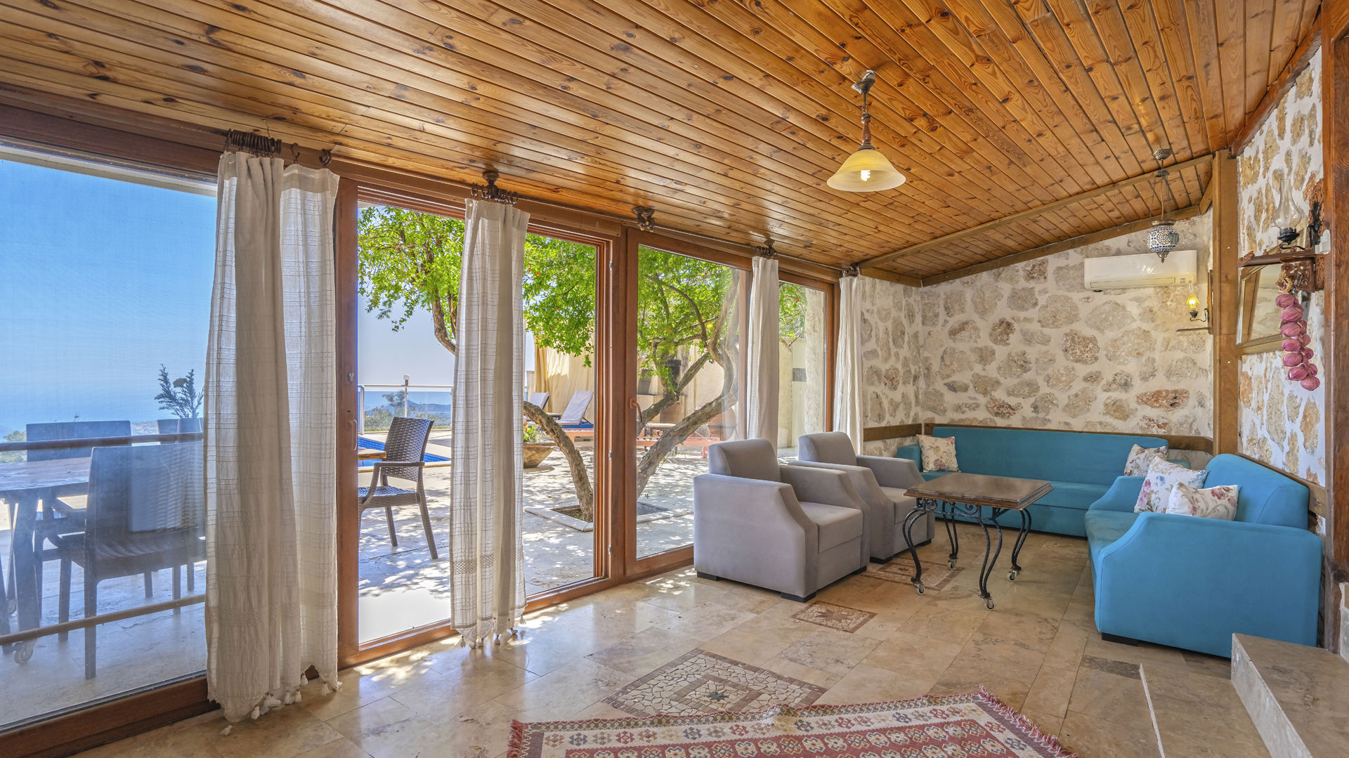 Salon : Salonumuzda oturma grubu, klima, LCD TV, sehpa, uydu alıcı bulunmaktadır. Havuz terasına çıkış yapılabilmektedir.