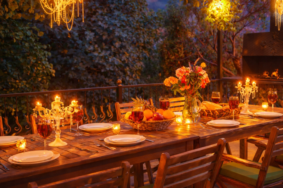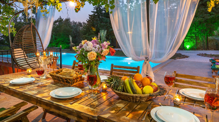 Etkileyici tatlı su havuzuna sahip devasa teras 15 x 6 m (1,5 m derinliğinde), Roma basamaklarına sahiptir ve şüphesiz bu mülkün önemli bir özelliğidir. Şezlonglar, şemsiyeler ve rattan salıncak havuzu süslüyor ve havuzun ve bahçenin etrafında dinlenmek ve bu muhteşem manzarayı izlemek için birkaç güneşli ve gölgeli alan var. Asma kanepesinin altında açık havada yemek deneyimi için barbekü, yemek masası ve sandalyeler bulunmaktadır. Bahçede herkesin keyfini çıkarabileceği bir masa tenisi masası da bulunabilir.