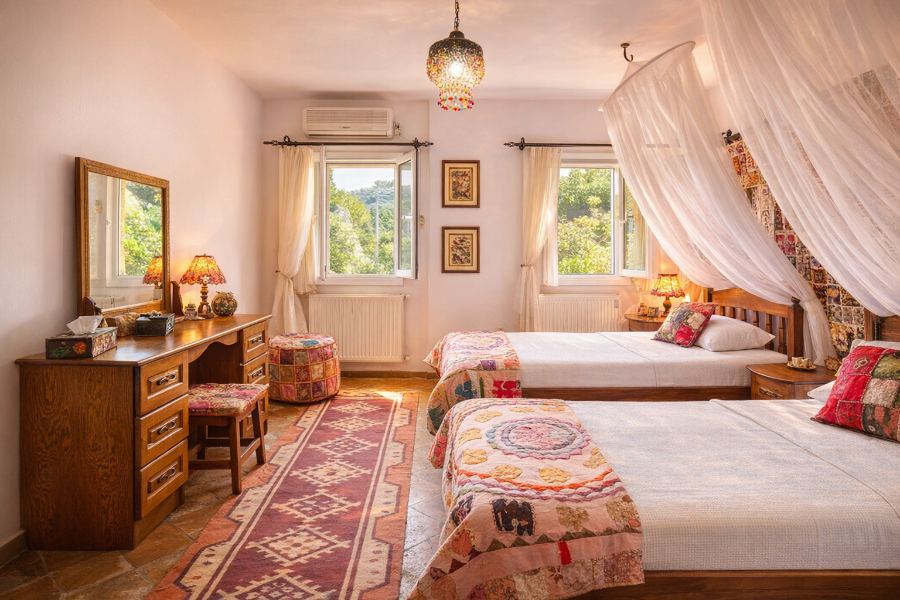 Yatak odası 1: İkiz ebeveyn duş odası, tek kişilik yataklar, zemin kat terasına açılan kapılar, büyüleyici deniz ve dağ manzaraları.