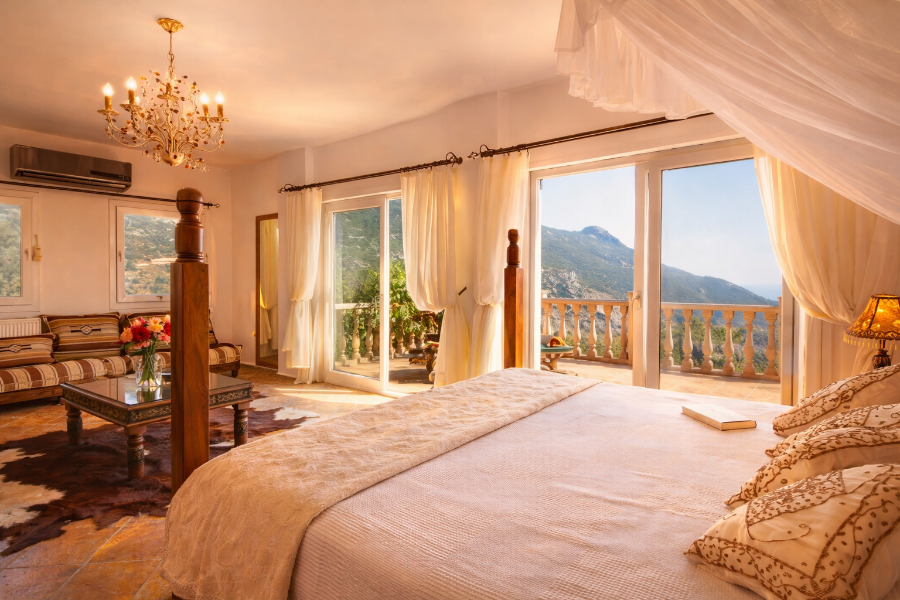 Yatak odası 4: Büyük çift kişilik ebeveyn duş odası, king boy yatak, büyüleyici deniz ve dağ manzaralı balkon.
