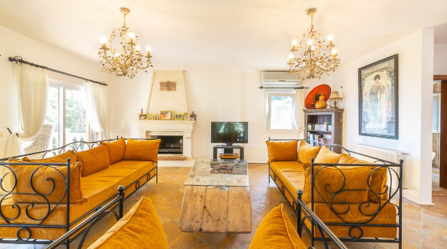 Oturma odası alanı bol miktarda konforlu oturma yeri, dekoratif bir şömine, LED uydu TV ve havuz terasının ve ötesinin muhteşem manzarasını sunar.