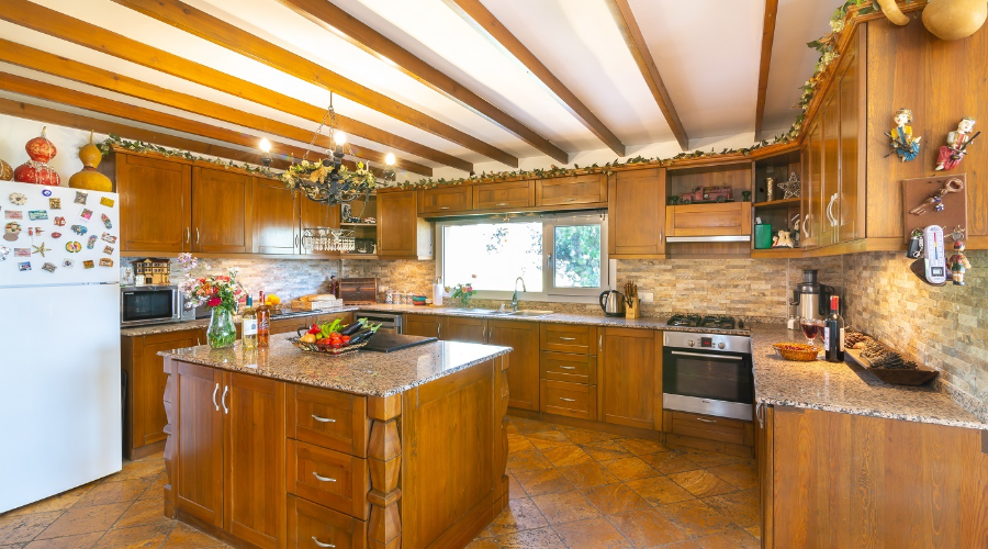 Bir çakıllı garaj yolu, bol miktarda özel park yerinin bulunduğu mekâna götürür. Baştan sona zarif bir şekilde döşenmiş ve içeri girdiğiniz anda belli olan cömert büyüklükte villaya çift kapılı kapılar açılır. Hafif ve havadar bir açık planlı yaşam alanı, elektrikli fırın, gazlı ocak, mikrodalga fırın, bulaşık makinesi, büyük buzdolabı, su ısıtıcısı ve ekmek kızartma makinesi içeren iyi donanımlı bir mutfakla sizi karşılar. Ayrıca merkezi bir mutfak adası ve mutfağın bitişiğinde 8 misafirin oturduğu bir yemek alanı da bulunmaktadır.